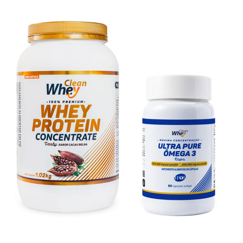 Kit - Clean Whey Concentrado Cacau Belga 1,02 kg + Clean Whey Ultra Pure Ômega 3
